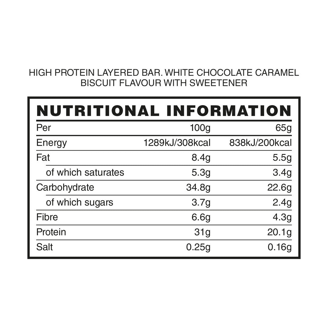 Protein Blend [Milk Protein Isolate, Hydrolysed Wheat Protein, Soy Protein Isolate, Whey Protein Isolate (Emulsifier: Sunflower Lecithin)(Milk)], White Chocolate with Sweetener [Sweetener (Maltitol), Cocoa Butter, Whole Milk Powder, Emulsifier: Lecithins (Soya), Natural Vanilla Flavouring], Humectant [Glycerol], Caramel Flavour Filling [Humectant (Glycerol), Maltodextrin, Oligofructose, Bulking Agent (Maltitol Powder), Coconut Oil, Skimmed Milk Powder, Modified Starch, Water, Colour (Plain Caramel), Gelling Agent (Pectin), Stabiliser (Calcium Lactate), Emulsifier (Rapeseed Lecithin), Natural Flavourings, Salt, Thickener (Xanthan Gum)], Soluble Tapioca Fibre, Sweetener [Maltitol Syrup, Sucralose], Water, Biscuit Crumble [Wheat Flour, Sugar, Vegetable Oils (Palm, Rapeseed), Candy Sugar Syrup, Raising Agent (Sodium Hydrogen Carbonate), Salt, Cinnamon], Natural Flavouring, Cinnamon.